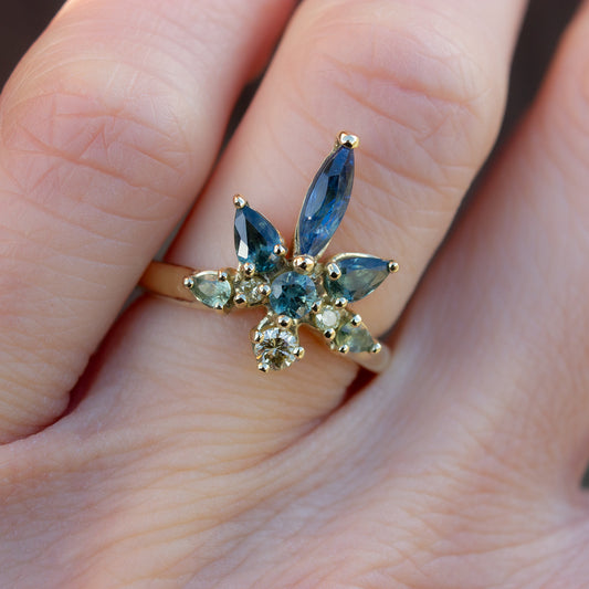 One Of A Kind Water Lily Ring - Teal sapphires And Natural Yellow Diamonds